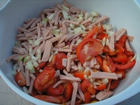 Zwiebeln und Knoblauch in Öl goldgelb anschwitzen, Tomatenmark unterrühren, Paprika und Sellerie zufügen und mit andünsten – herausnehmen.